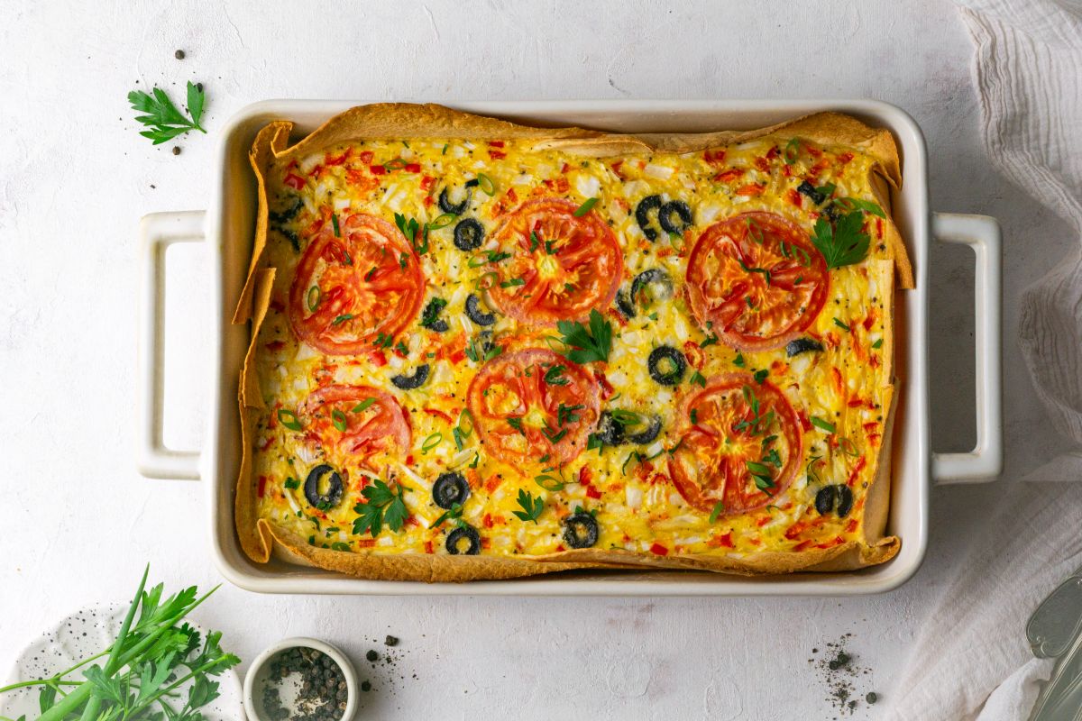 Preheat the oven to 375°F (191°C). Pour the mixture over the tortillas, top with tomato slices and olives.