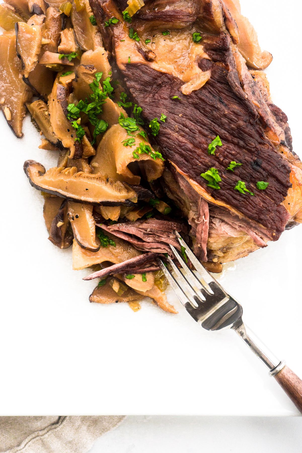 Deliciously meaty beef ribs are seared to perfection and then braised with savory shiitake mushrooms, garlic, celery and onions. The pan is deglazed with apple cider vinegar to balance the salty meaty flavors and then covered with collagen filled beef stock and braised until meat is tender, falling-off-the-bone.