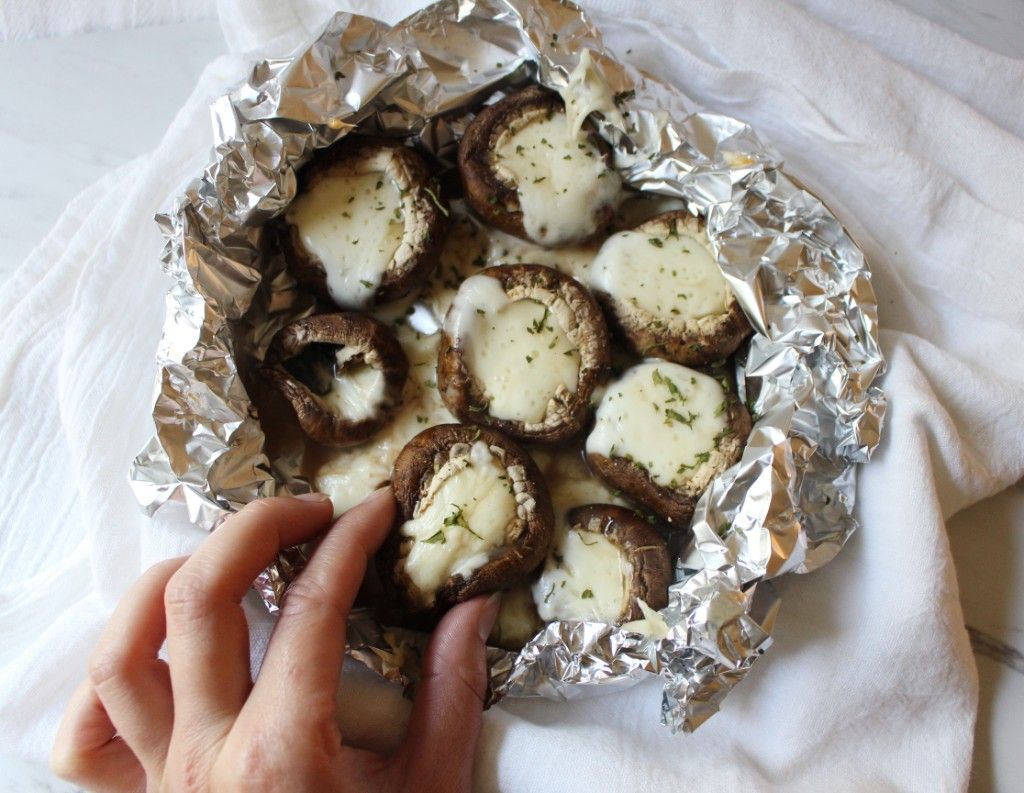 Fold the aluminum foil over the mushrooms, wrapping in additional foil if necessary. When the mushrooms are encased in the foil, set the package onto the center rack of your oven - no tray necessary. Bake for 30 minutes or until cheese is completely melted and mushrooms are soft.