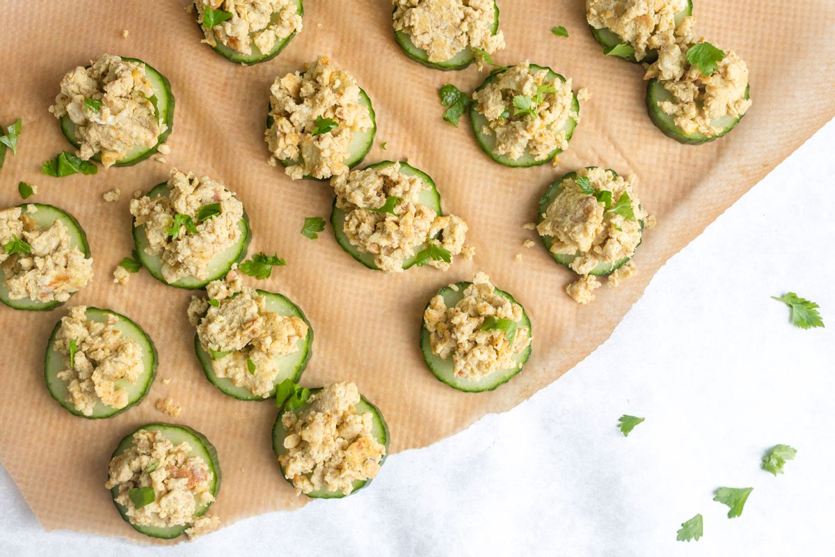 These simple cucumber bites are topped with a helping of creamy and spicy scrambled eggs and a touch of fresh parsley.