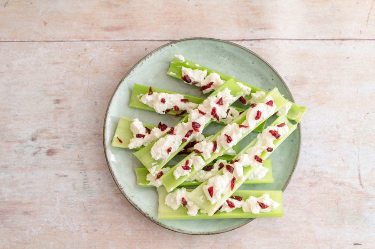 These tasty celery stalks are loaded with creamy lemon whipped ricotta cheese and topped with tart dried cranberries.
