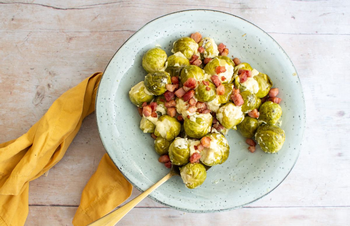 Transfer the cooked sprouts and cheese sauce to a serving dish. Scatter the crispy pancetta over the sprouts. Serve hot with your Keto Christmas main.