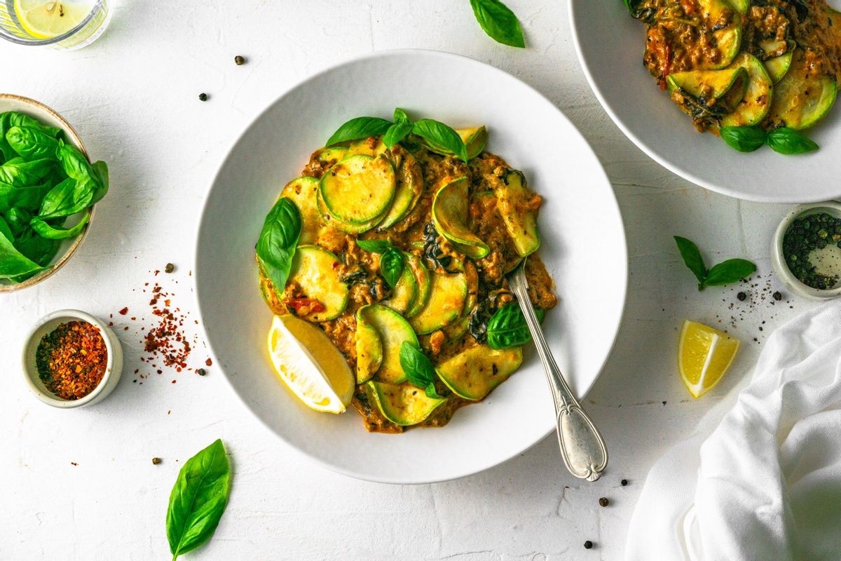 Thinly slice the zucchini using a mandolin on the thinnest setting. Finely dice the onion and tomatoes, mince the garlic, and wash the baby spinach. Blanch the zucchini in hot water for about 30-45 seconds then drain and transfer them to a plate lined with a paper towel to drain any excess water.