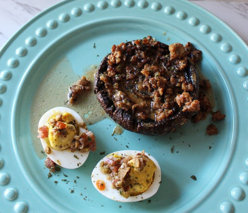 Keto Portobello Mushrooms w Italian Sausage Gravy and Muffuletta Deviled Eggs