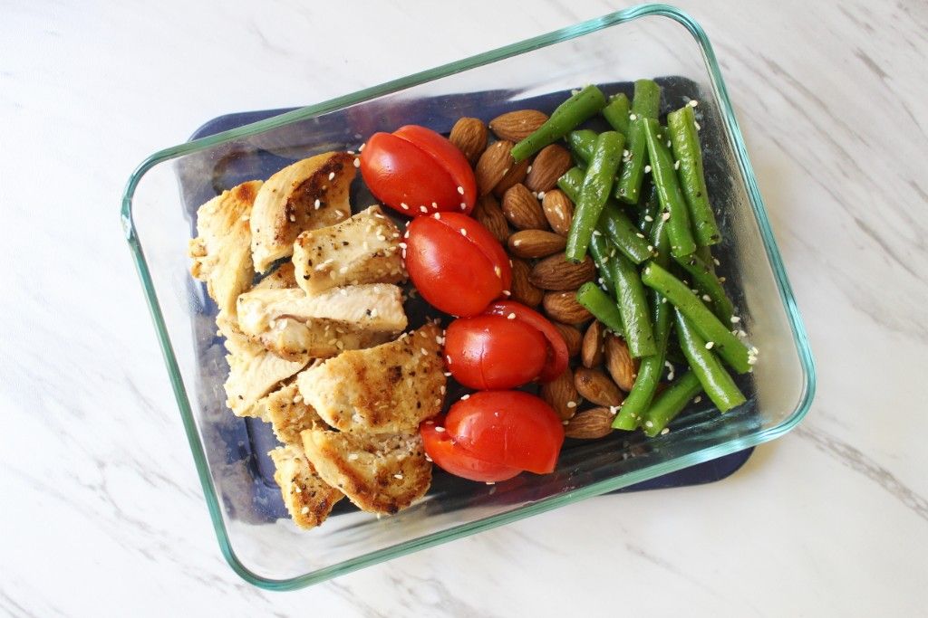 Place the green beans in a meal prep container. Follow this by arranging the chicken, tomatoes, and almonds in the container as well.