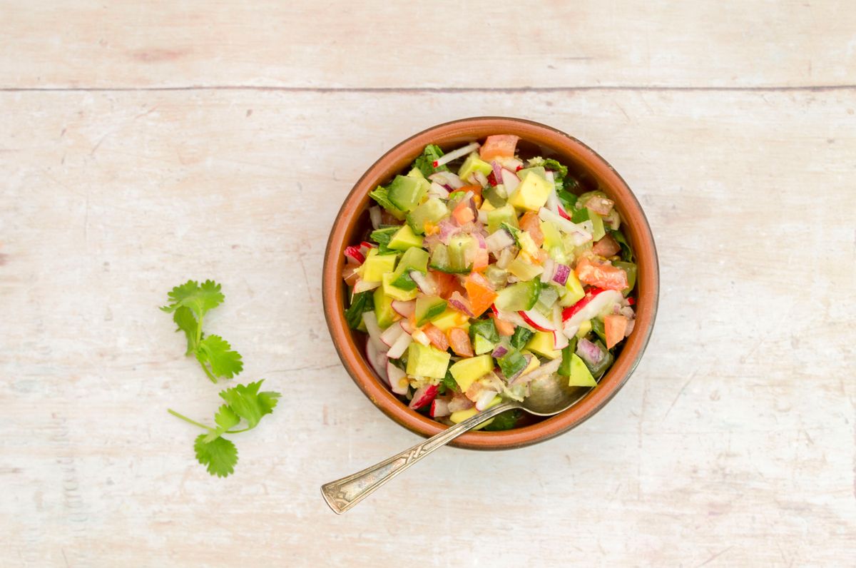 Finely chop the avocado, cucumber, onion, tomato and radishes. Grate the ginger and roughly chop the herbs. Add all to a mixing bowl along with the lemon juice, olive oil, salt and pepper. Mix well to combine and refrigerate until ready to serve.