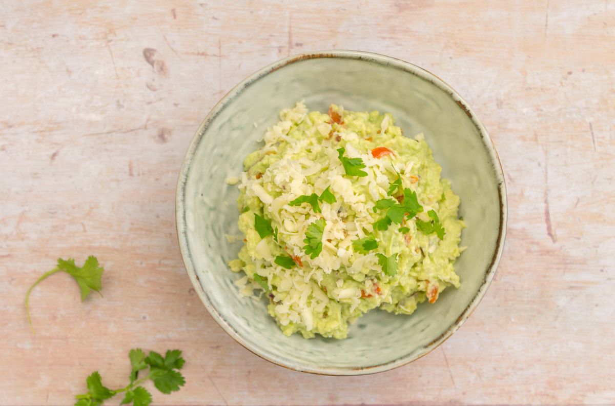 This avocado dip is rich with sour cream, Gouda cheese, sweet red onion and juicy tomatoes.