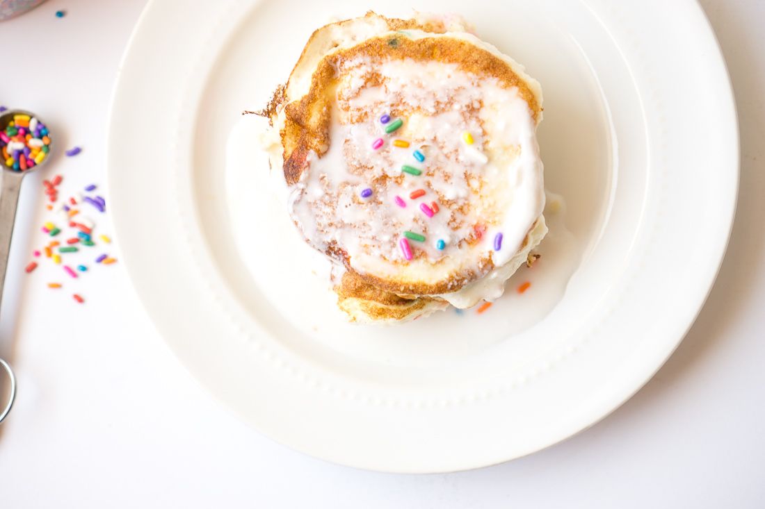 Sometimes I get a craving for pancakes! This is a great alternative to the real deal. Make sure to whip the egg whites to a stiff peak. This will ensure your pancakes will be very fluffy...or else they will be flat! Once egg whites are at a stiff peak, sprinkle the flour mixture on top and fold in the egg whites so you keep as much air as possible. Also use long sprinkles not the round kind or else they will sink to the bottom of the batter.