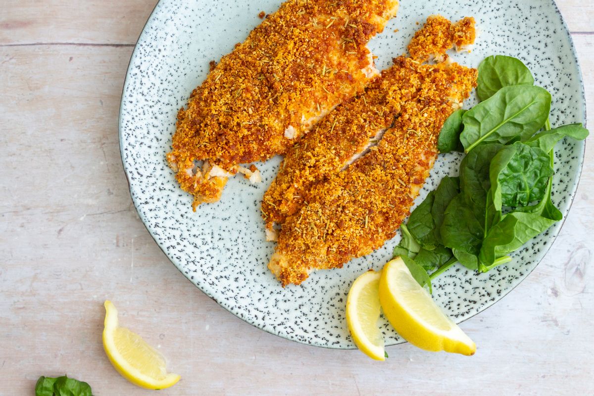 Arrange the fish fillets on the prepared oven tray. Divide the chorizo breading evenly between the two fillets, covering the tops of each in an even layer. Press the breading down gently so that it sticks to the fish. Transfer to the oven and bake for 12 minutes or until the fish is entirely cooked through and the topping is golden brown.