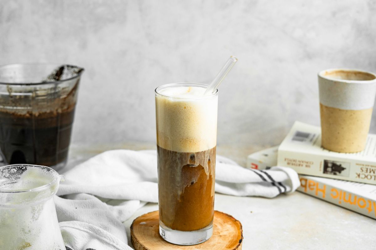 Prepare 4 serving glasses, and add ½ cup of ice to each. Add the milk, heavy cream, vanilla extract, and stevia to a large cup. Use a handheld milk frother to froth the mixture until it is thick and has increased in volume.Step 4