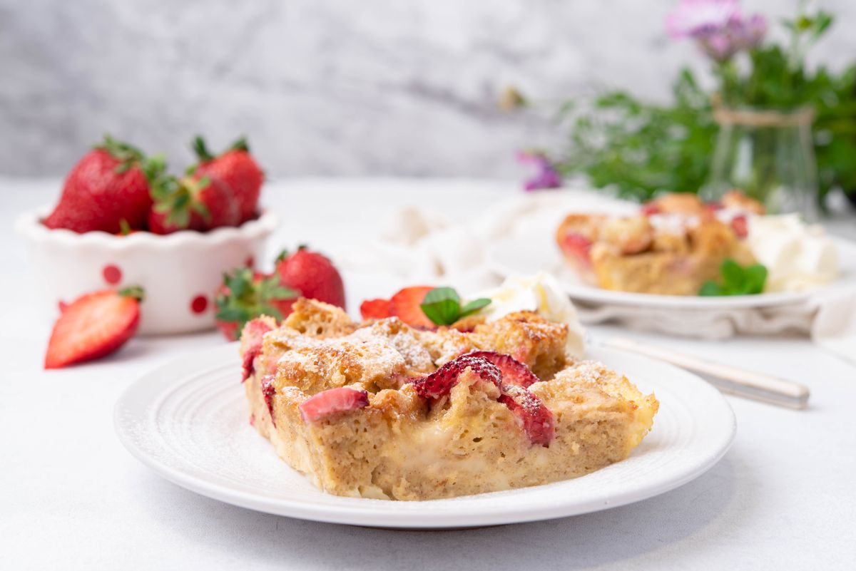 Our strawberry bread and butter pudding is a beautiful Keto comfort food you can enjoy whenever you wish and still stay within your daily carb limits! This fantastic recipe is absolutely delicious when served warm or cold and pairs perfectly with some sugar-free whipped cream. We added some sliced strawberries to this recipe, but feel free to replace them with your favorite low-carb berries or omit them altogether – the recipe will still be perfect. A piece of this wonderful Keto bread and butter pudding is fantastic to accompany your coffee or tea. Enjoy!
