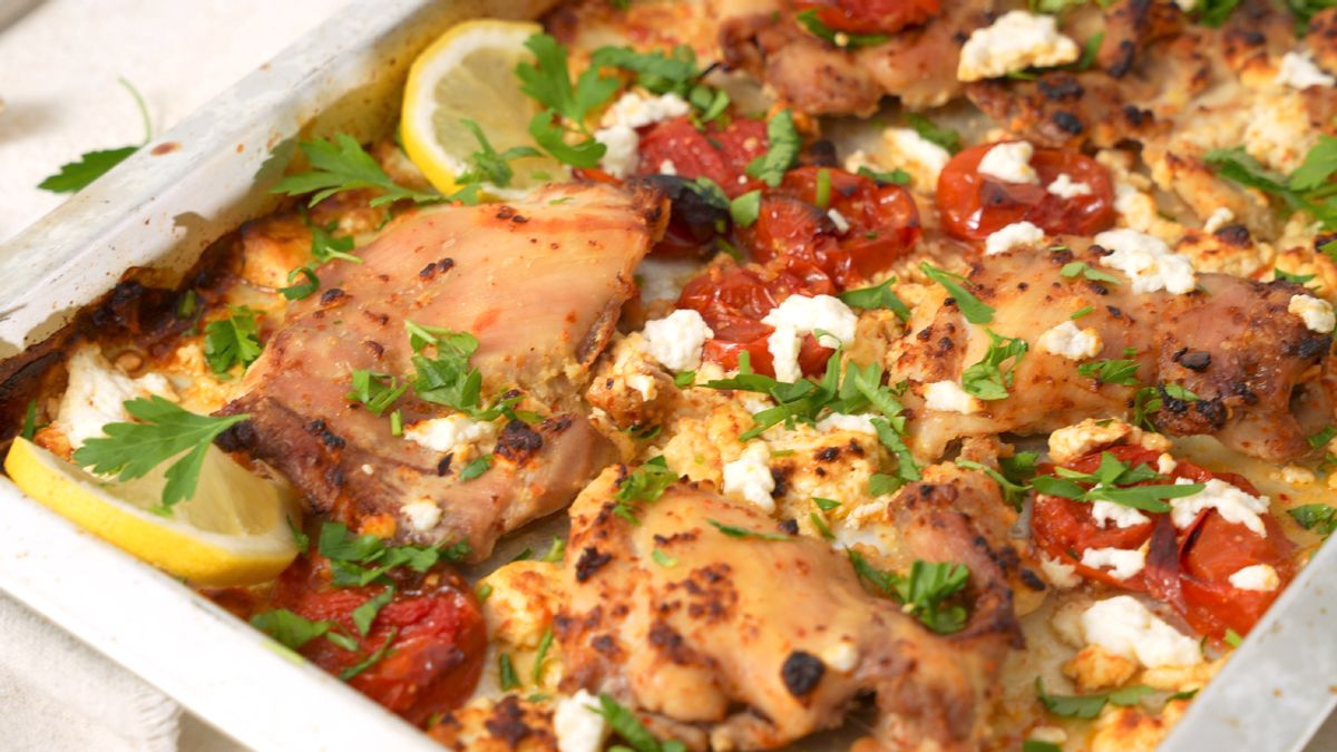 Preheat your oven to 200C/400F. Add the chicken thighs, cherry tomatoes, crumbled feta, olive oil, lemon juice, crushed red pepper, and salt to a bowl. Mince the garlic and add it to the bowl.Step 2