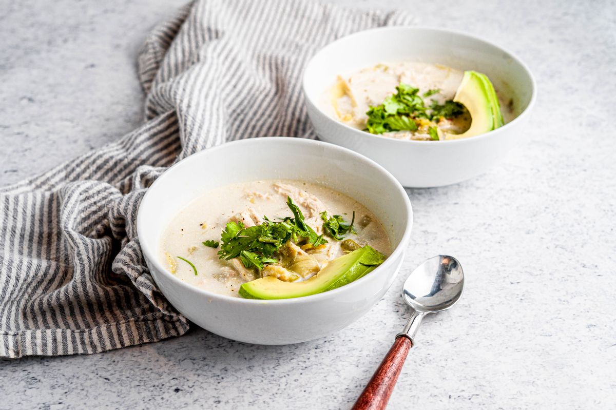 You will love this creamy Keto Slow Cooker Chicken Chili. The base of this chicken chili is made from chicken broth and chicken breast simmered slowly in a slow cooker. It is seasoned with vegetables like bell pepper, onion, and garlic cloves. The broth mixture is flavored with ground cumin, paprika, and coriander to make it warm and comforting. Artichoke hearts stud the chili and add an awesome texture and depth of flavor! Artichoke hearts make for an unconventional but delicious low carb addition to chili and add healthful prebiotic fiber to your diet. Cream cheese is the secret to making this chili creamy with a hint of tartness. Our Keto Slow Cooker Chicken Chili would be delicious on any cold day. It is one of the best recipes to help meet protein goals too.