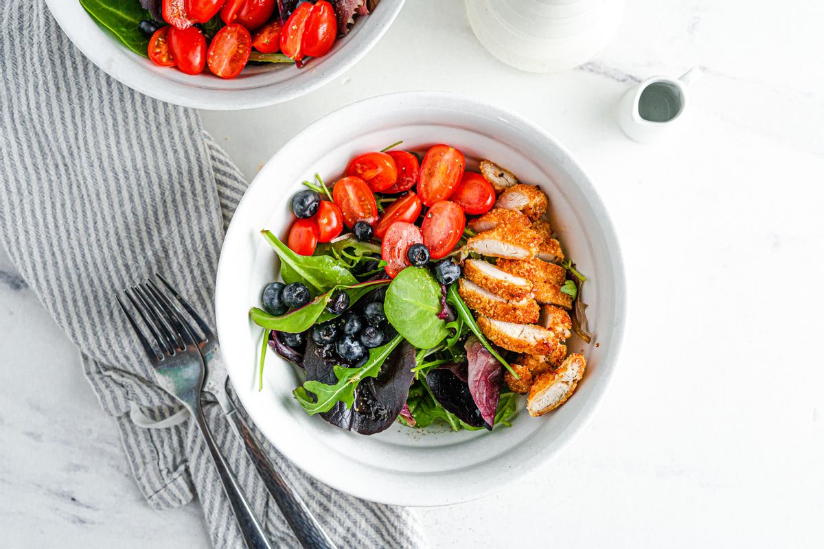 You will love this quick and easy Keto meal prep dinner recipe prepared with crispy almond flour breaded chicken on top of a luscious bed of green salad leaves. The salad is topped with sweet cherry tomatoes and tart blueberries, then dressed with a delicious garlicky red wine vinaigrette. We love salads because they are one of the best ways to enjoy a Keto meal full of vitamins and minerals (especially when you use sea salt for seasoning the dressing). Salads like these, since they can be eaten cold, are great for meal prepping and do not need to be reheated before enjoying. You can portion several salads at a time and store them in the fridge for easy meal prep. Meal prepping is great tool for those sticking to a calorie limit or for those looking to hit higher calorie limits for building muscle.