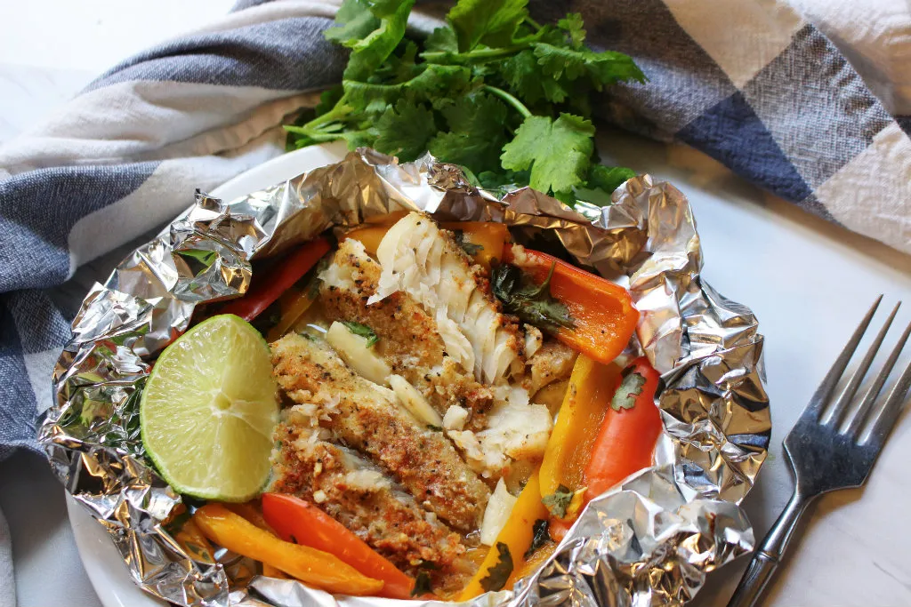 Perfectly seasoned cod fillets are a delicious dinner. This fajita-inspired recipe uses a mix of southern spices and a handful of juicy peppers and fresh cilantro. A squeeze of lime at the end pull these Tex-Mex flavors together. When baking, you can place your foil packet on a sheet tray in the oven to avoid over cooking. However, this may increase your baking time, so keep your eyes on the cooking process.