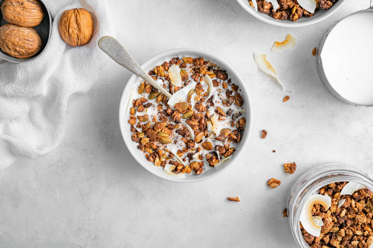 The choices are endless; as long as you use raw nuts, you can prepare any low-carb milk and granola you prefer. You can use almonds, cashews, hazelnuts, macadamia, or brazil nuts. For a nut-free version, use sunflower seeds.