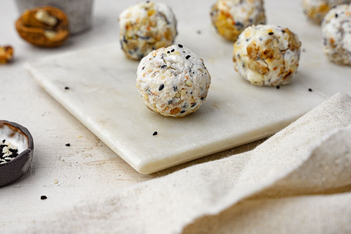 Add the cream cheese to a bowl. Grate the parmesan, finely chop the walnuts, and add them in. Add the sunflower seeds, black sesame seeds, salt, and crushed red pepper.Step 3