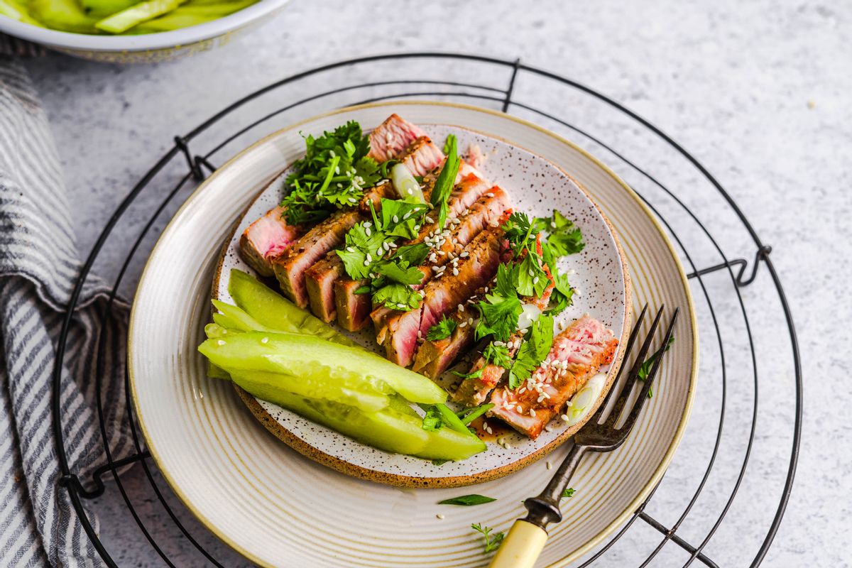 Ahi tuna is a wonderfully Keto and Low Carb protein option. We have seasoned the ahi tuna simply with salt and freshly cracked black pepper. Then, the fish is seared on both sides until the desired doneness is achieved. The cooked ahi tuna is drizzled with a ginger and coconut amino acid glaze. The glaze is made from combining coconut aminos, minced ginger and rice vinegar, simmered until it is thickened and slightly caramelized. The tuna is glazed and then topped with chopped cilantro and sliced green onions as well as a sprinkle of sesame seeds. It is served alongside a crispy and cool cucumber salad. This is a delicious ahi tuna recipe that is easy to make and brings out the natural flavor and sweetness.