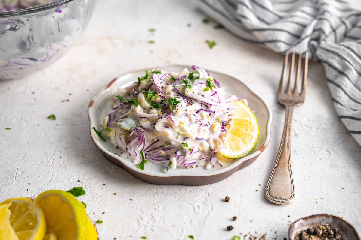 Add in the shredded red cabbage and red onion. Toss together until well combined, and the vegetables are well coated in the creamy sauce. Taste and adjust the seasoning to your liking.Step 3