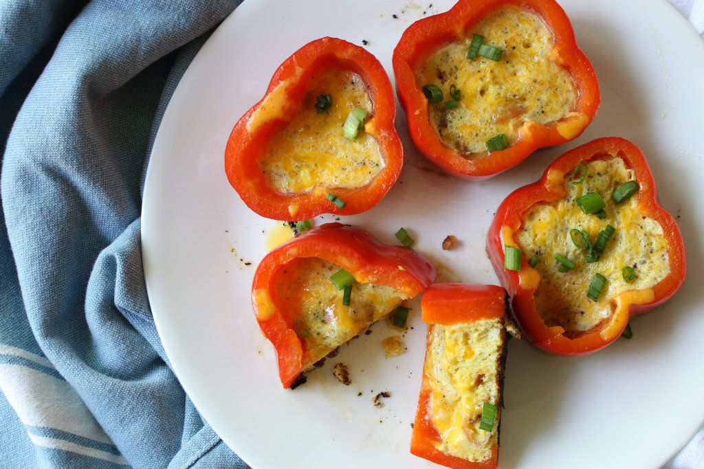 Fluffy egg batter is cooked inside a red bell pepper shell and filled with chopped bacon bits and shredded cheese. Each bite is a little crunchy, a little chewy, meaty, and cheesy! The bottoms of these towers have a slightly charred bottom, which gives a savory edge to your keto breakfast. Yum!