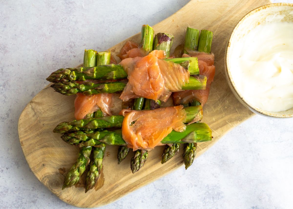 This delicious Keto asparagus recipe makes a tasty snack or side, loaded with flavor and healthy fats. Our low carb dish is prepared with fresh asparagus spears, zesty lemon juice, creamy mayonnaise, and decadent smoked salmon. The asparagus is simply oven-baked with a little oil and lemon juice until perfectly tender, then wrapped in slices of salmon. Once prepared, the asparagus bundles are served with a simple lemon mayonnaise for dipping.