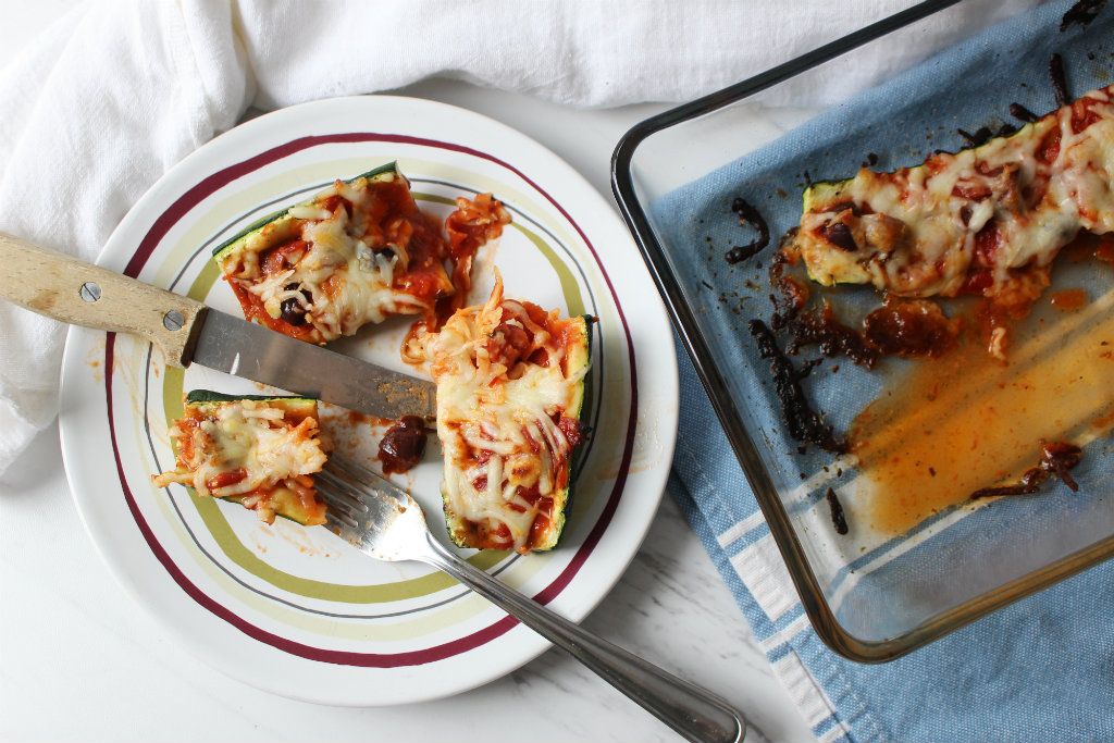 Toss out the pizza crust, but keep all the delicious toppings and cheese! A large zucchini is stuffed with supreme pizza toppings like marinara sauce, black olives, pepperoni, and plenty of mozzarella cheese. Make this recipe for a simple lunch or double up the recipe for meal prepping!
