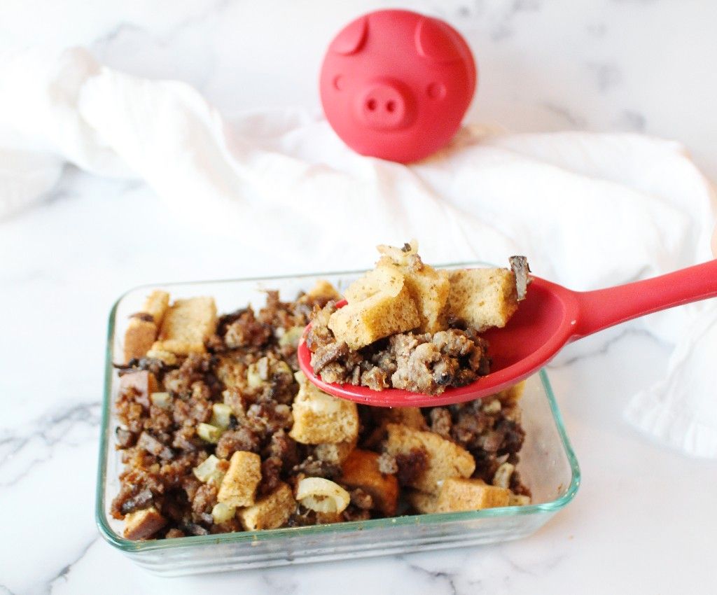 You’ll find your stuffing much more enjoyable if you cut your croutons into small pieces instead of misshapen or large pieces. This way, the stuffing will fill your dish, be easier to serve, and become hydrated throughout. The same goes for any extra ingredients you chop and add to the dish like any vegetables. You can slightly undercook the ground pork on your stove so it stays moist in your stuffing while it bakes in the oven.