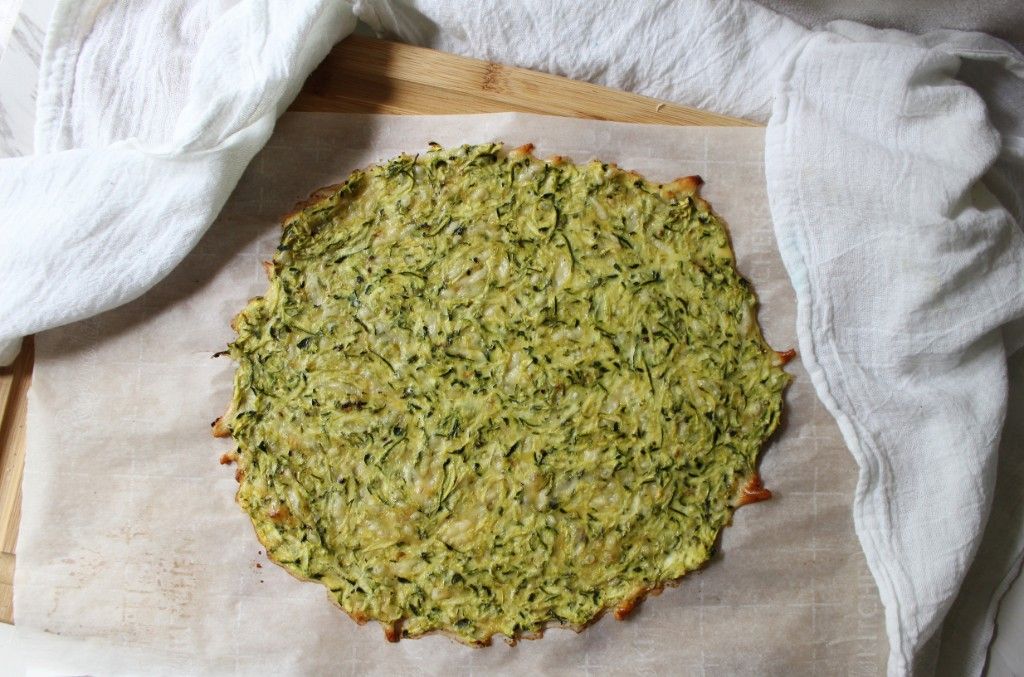 Line your sheet tray with a new piece of parchment paper. Use your spatula to arrange the zucchini mixture on the sheet tray into a circle. The original recipe here should make a 10” thin-crust pizza. Bake the zucchini crust for 22-25 minutes, until the crust has a golden brown edge and you can see the egg and parmesan completely cooked through. You can then cool this finished crust and use it for “leftover” cold pizza recipes. If you want to bake a hot pizza, arrange your sauce and toppings on the finished zucchini crust pizza. Bake the pizza at 350 degrees until you see your toppings cooked and browned and any cheese bubbled and browned as well.