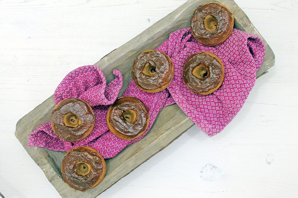 To prepare the doughnut glaze, add the almond milk to a small pan along with the almond butter, remaining erythritol, lakanto syrup, remaining vanilla, remaining cinnamon, ginger and nutmeg. Bring to a rolling boil for a minute then reduce to a simmer. Continue to simmer, stirring regularly until you have a thickened toffee like consistency.
