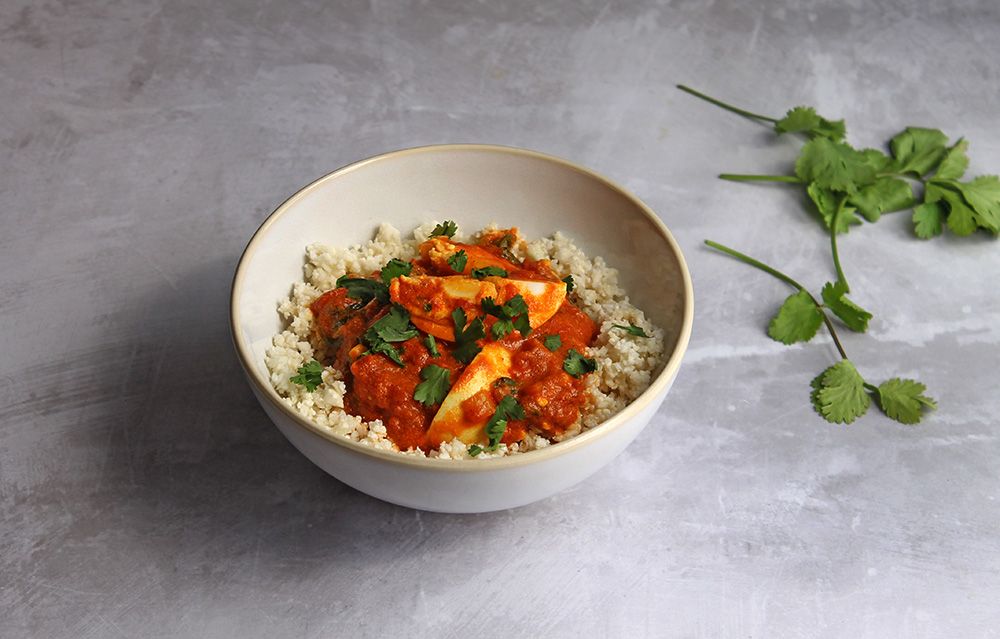 Whilst the eggs are heating, melt the remaining coconut oil in a small pan over a low/medium heat. Add the cauliflower rice, season to taste and cook for a few minutes until hot through. Serve the curry with the rice and scatter with fresh cilantro.