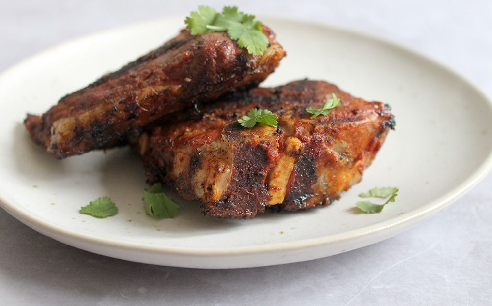 These lamb chops are coated in a tomato based spiced marinade and griddled until caramelized on the outside and tender in the center.