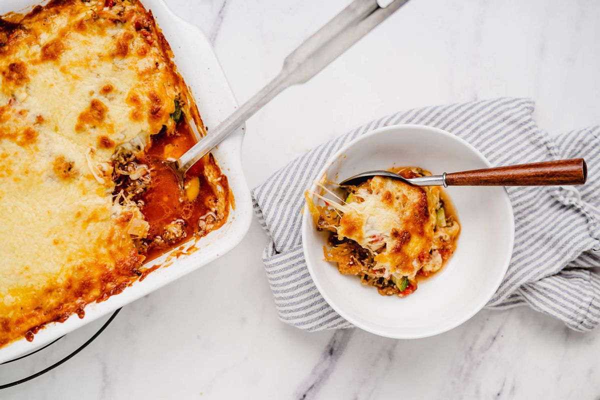In a large mixing bowl, combine the spaghetti squash, diced zucchini, white onion, tomato sauce, ground beef, and parmesan cheese. Mix well with a wooden spoon—taste adding more salt as desired.Step 6