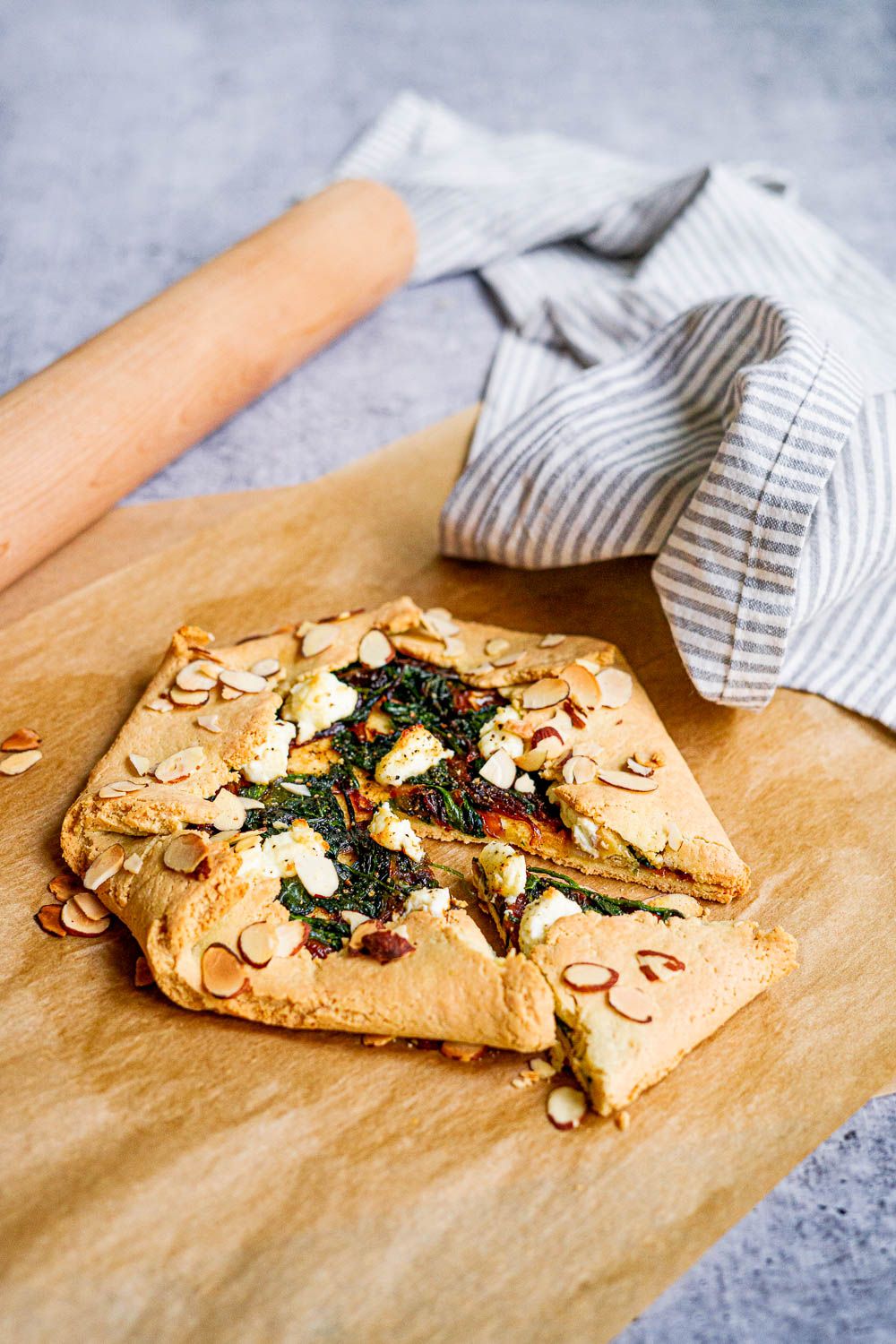 This delicious savory Keto Spinach Goat Cheese Galette is made with a crispy Keto dough. The Paleo dough is made from simple ingredients: almond flour, an egg, water, baking powder, and xanthan gum. The dough is rolled thin and then topped with a mixture of caramelized onions, sauteed baby spinach, and then studded with tart and creamy goat cheese. The edges are folded up around the mixture and then baked to golden brown perfection.