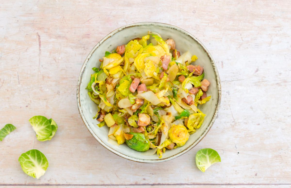 Thinly slice the leeks and sprouts, discarding the tough bases and any stringy outer leaves. Add to the pan along with the lemon zest, salt and pepper. Stir well to combine and continue to pan fry for a further 3-4 minutes until the pancetta is completely cooked through and golden, and the vegetables are tender.Step 3