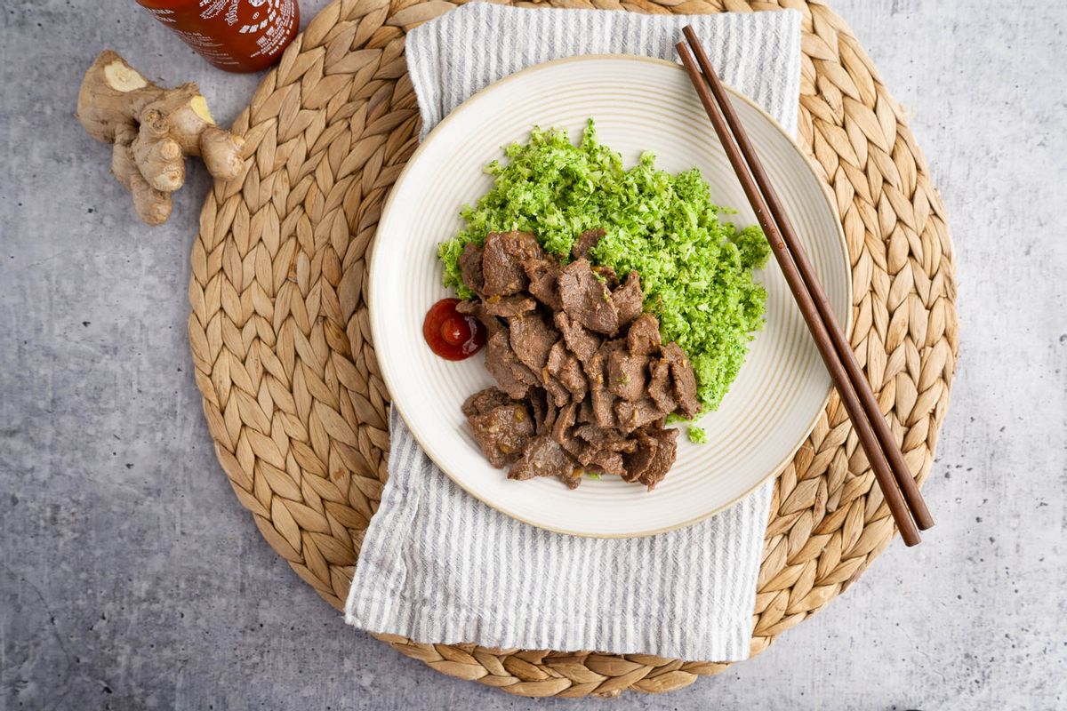 Remove the cooked meat to a warm bowl and repeat with the remaining beef. Serve the beef over the heated broccoli rice.