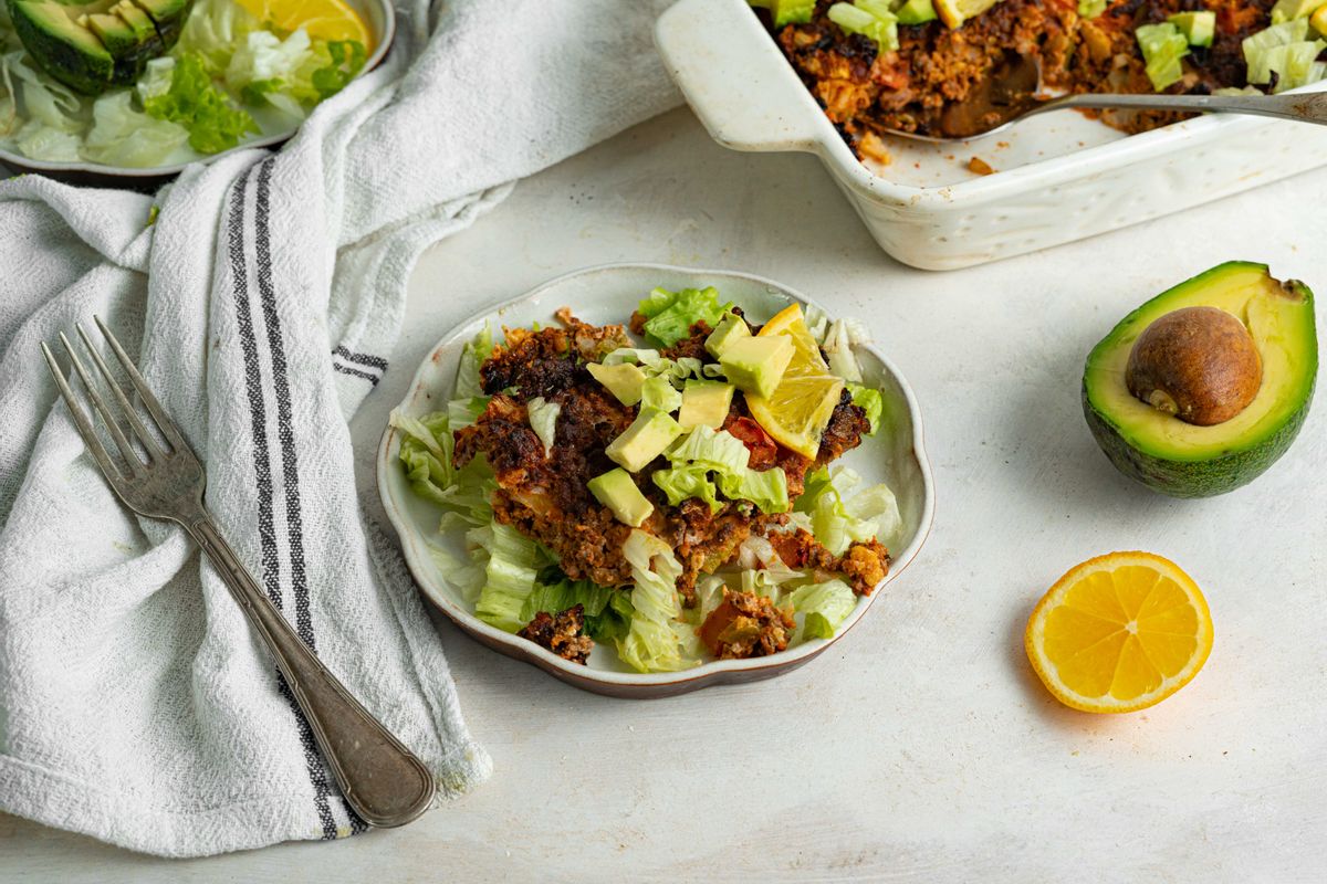 If you are a fan of tacos, you will LOVE this low-carb, Whole30 compliant casserole. It is meaty, saucy, and mouthwatering. This recipe is perfect for beginner cooks and only needs 15 minutes of active work. The ingredients for this Whole30 casserole are similar to any other low carb tacos. They start with a base of protein, in this case, ground beef, mixed with low-carb veggies and spices. It is baked to golden perfection then served with shredded lettuce, avocado, and lemon slices.