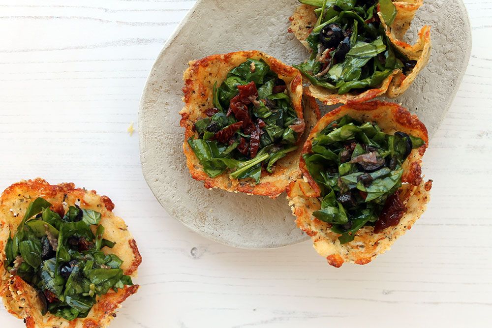 These delicious cheese baskets are rich with salty parmesan and creamy mozzarella and stuffed with a pizza inspired salad!