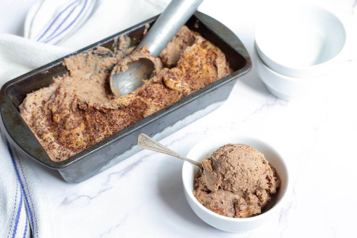 Pour into a freezer-safe container and drop in the peanut butter. Give it a swirl and sprinkle more cocoa shavings on top. Leave to freeze for 4-5 hours before serving.