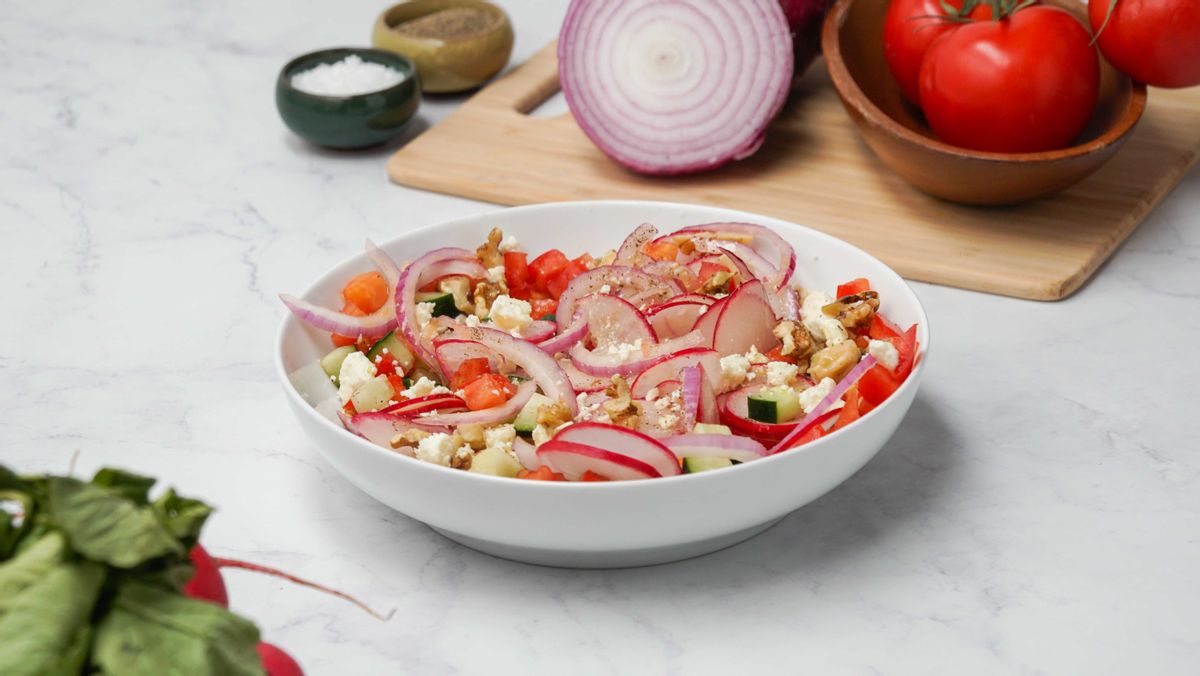 Finely dice the cucumber and tomato and thinly slice the radishes and red onion. Add to a serving bowl and toss to combine.Step 3