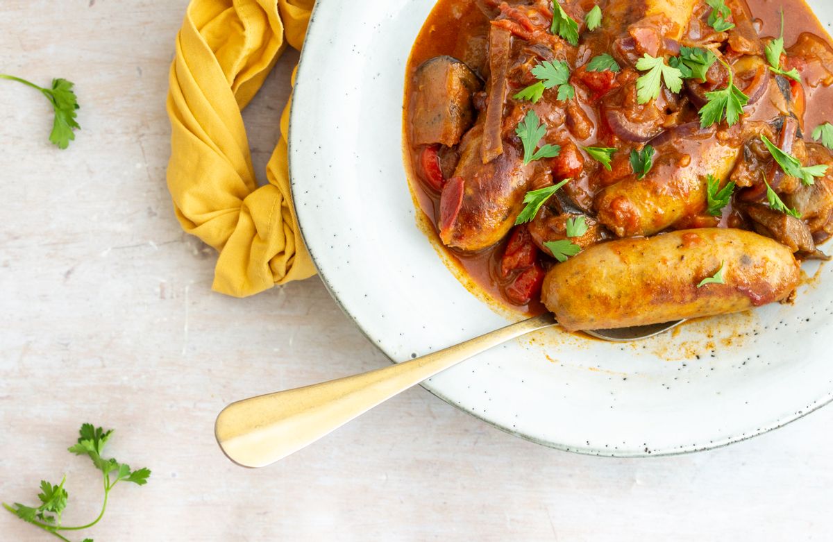 A delicious change with sausages, very filling could do vegetarian/vegan version without sausages. Have served with cauliflower mash & rice on 2 occasions both good 😊