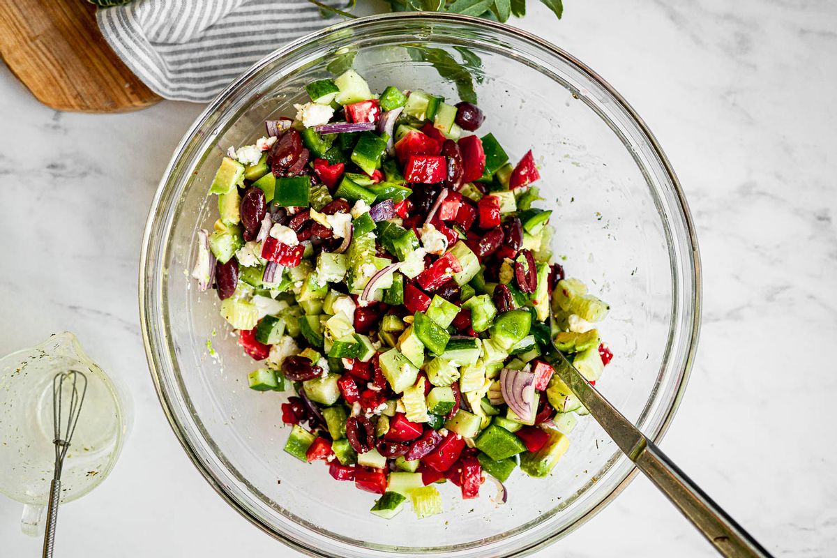 Begin by preparing all the vegetables for the salad. Dice the cucumber into a ½” x ½” cube. You do not need to remove the seeds from the cucumber unless the seeds are too large and fibrous. If you remove the seeds make sure the amount of cucumber still weighs one pound without seeds. Match the other vegetables to this size by cutting them roughly the same. Dice the tomatoes, do not remove the seeds. Slice the red onion by first cutting off both ends. Then slice the onion in half and remove the skin. Slice each half onion lengthwise and then use one of the sections by slicing them into short julienned pieces. Drain and slice the kalamatas in half. Slice an avocado in half, remove the seeds and skin. Then dice the avocado into cubes. Slice the flesh off the green bell pepper and then cut each section into a ½” x ½” dice as well. Place all the chopped vegetables into a large mixing bowl and set aside.Step 2