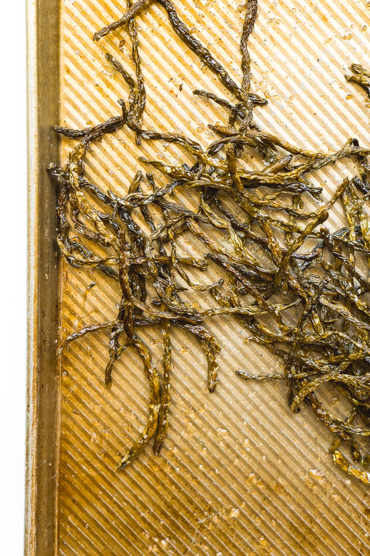 Preheat an oven to 250 F degrees. Wash green beans and dry on a sheet tray lined baking sheet patting and rubbing them dry the rest of the way with an additional paper towel.Step 2