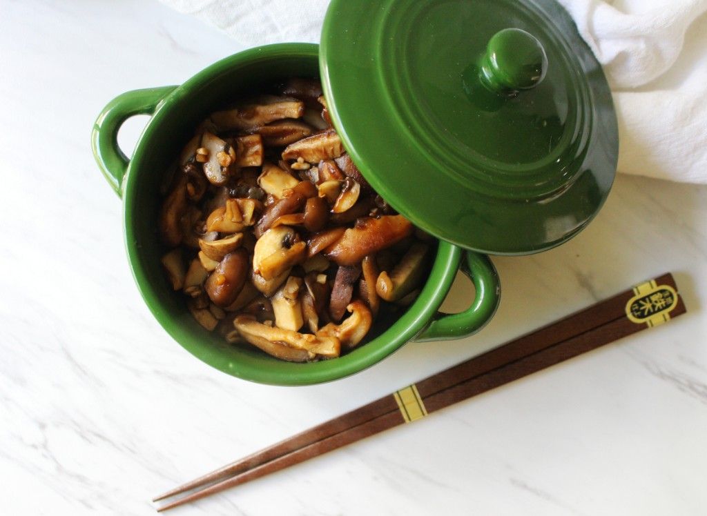 Combine both mushrooms and sauce in a pot over medium heat and place a lid on. Let the mushrooms cook down for about 2 minutes. Remove the lid and cook the mushrooms until the liquid evaporates and you are left with browned, saucy, slightly sticky mushrooms.