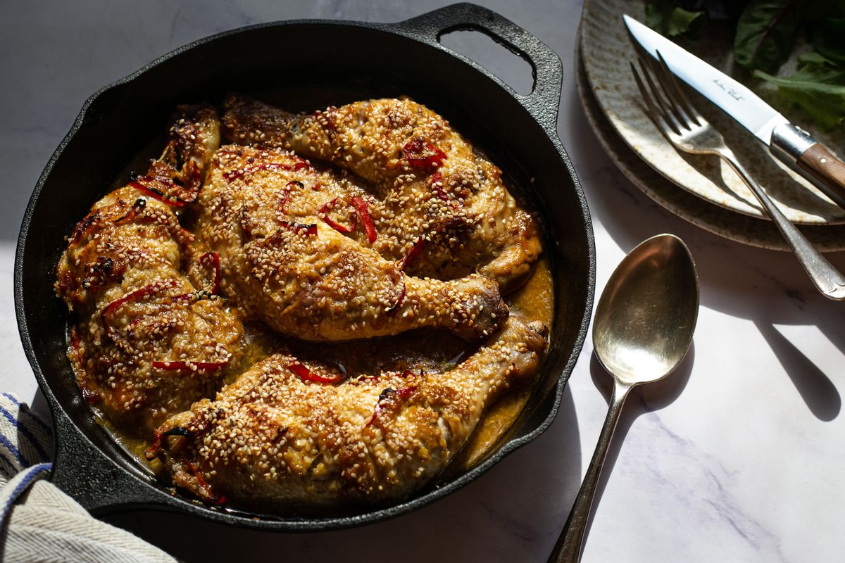 Cut the white ends of the scallions and discard them, then dice the green tops of the scallions in half lengthways. Place the scallions at the base of a skillet pan or ovenproof dish. Position the chicken over the scallions and scrape the marinade over the chicken. Sprinkle the remaining tablespoon of sesame seeds over the chicken.Step 4