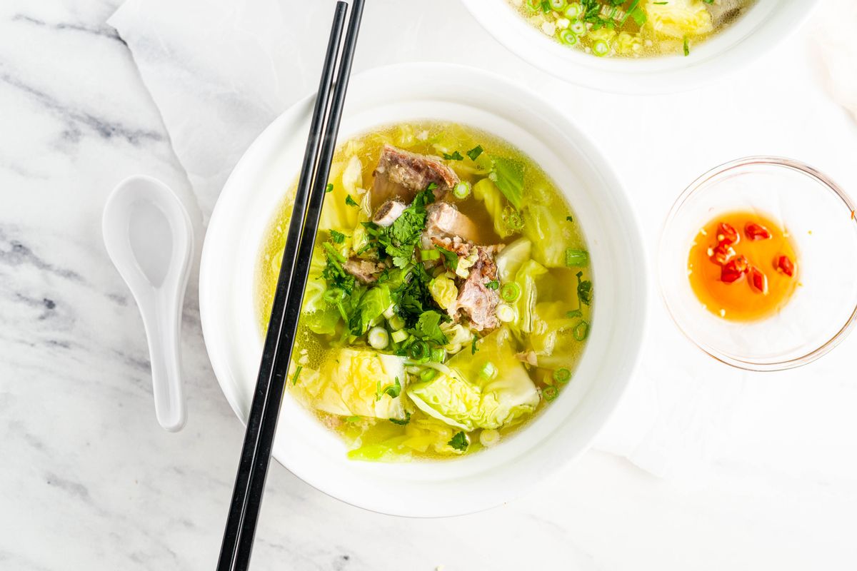 One of the most comforting soups is made with only a few simple ingredients. This soup is made by simmering pork spareribs for several hours in water seasoned with fish sauce and sea salt until tender. Cut cabbage is wilted into the soup once the meat is tender and succulent. You can serve the soup with cauliflower rice on the side and a small bowl of fish sauce, and chopped Thai bird chilies for dipping. The soup has a delicious pork flavor and is dotted with globules of pork fat. The cabbage gives the soup a slightly sweet taste and is comforting but easy to make. You will love this Paleo dinner recipe!