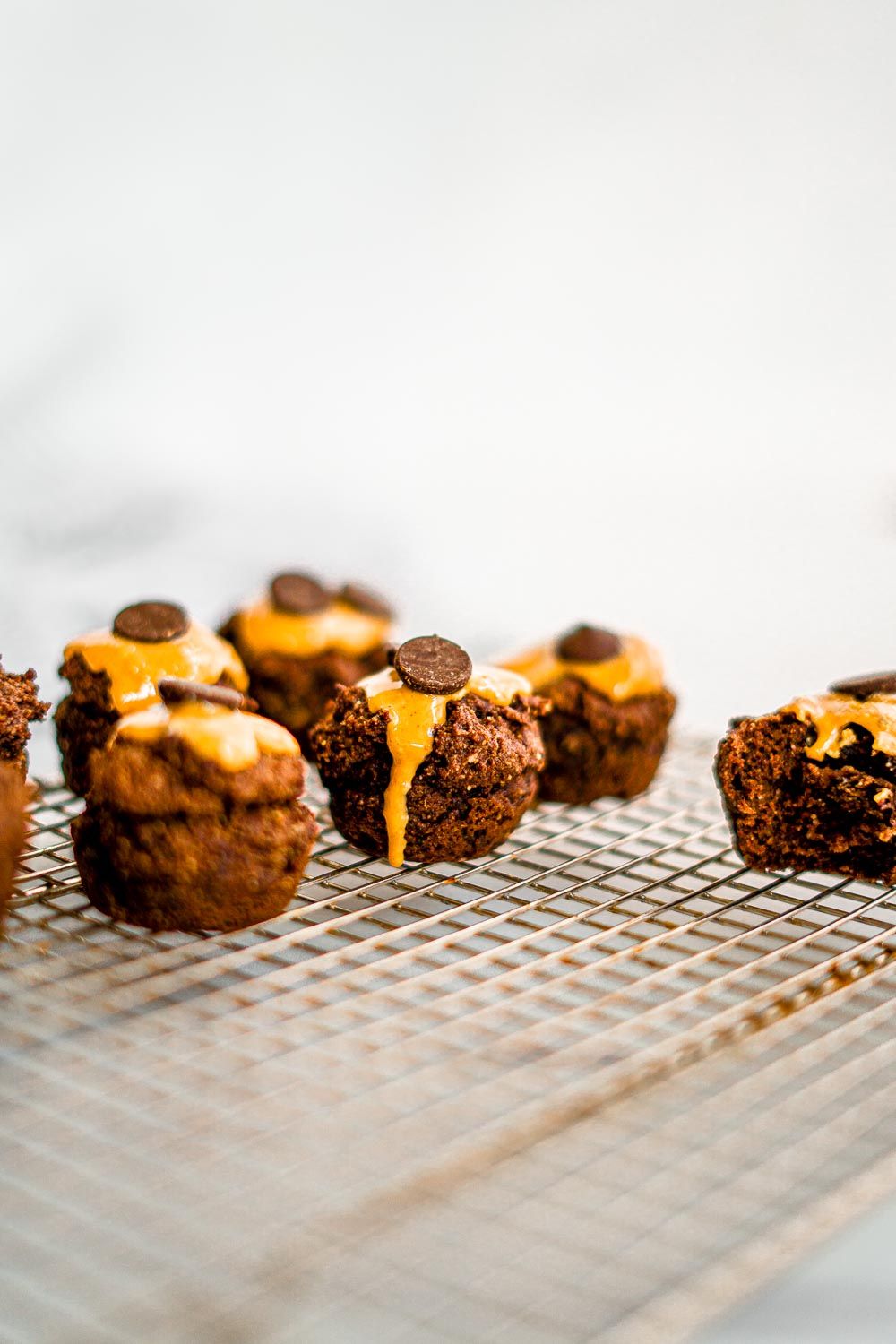 Top each cooled brownie bite with one teaspoon of natural peanut butter and one or two chocolate chips.