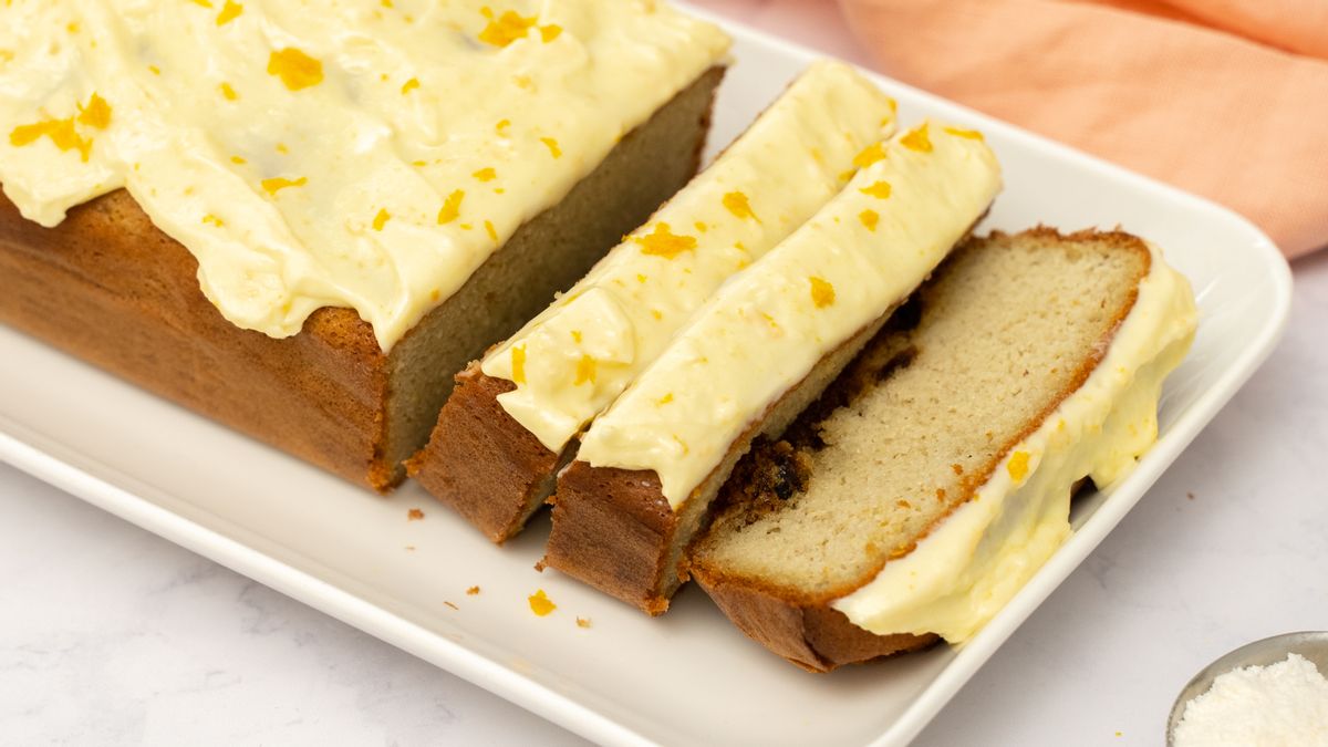 Use a spatula to spread the orange buttercream mixture evenly over the surface of the cooled cake. Slice the cake to serve. You will get 10 slices from the loaf.