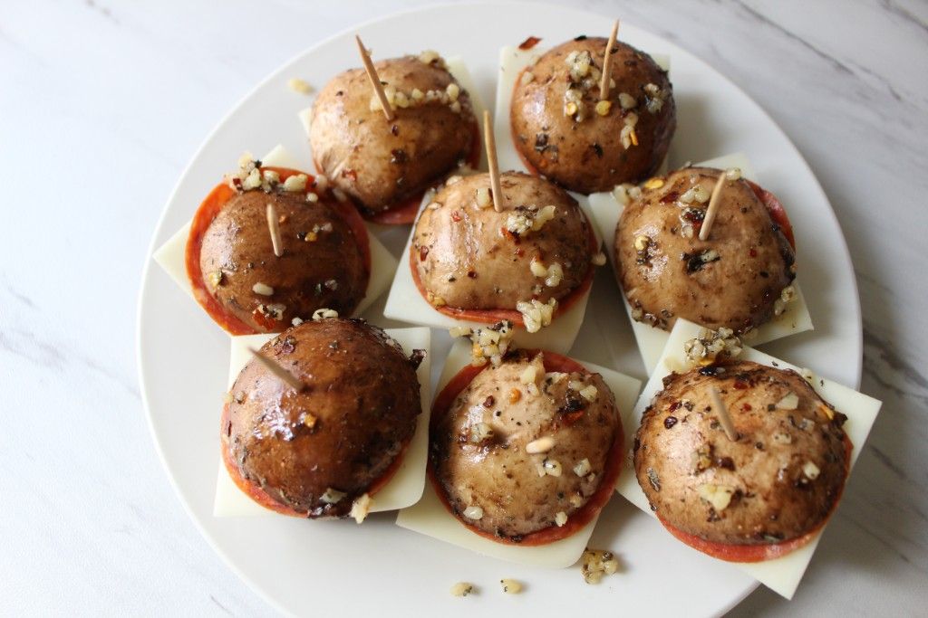 Create the stacks by sandwiching a piece of cheese and pepperoni between 2 matching pieces of mushroom. Secure with a toothpick. For serving, make sure to drizzle any extra seasoned liquids from marinating over the stacks.