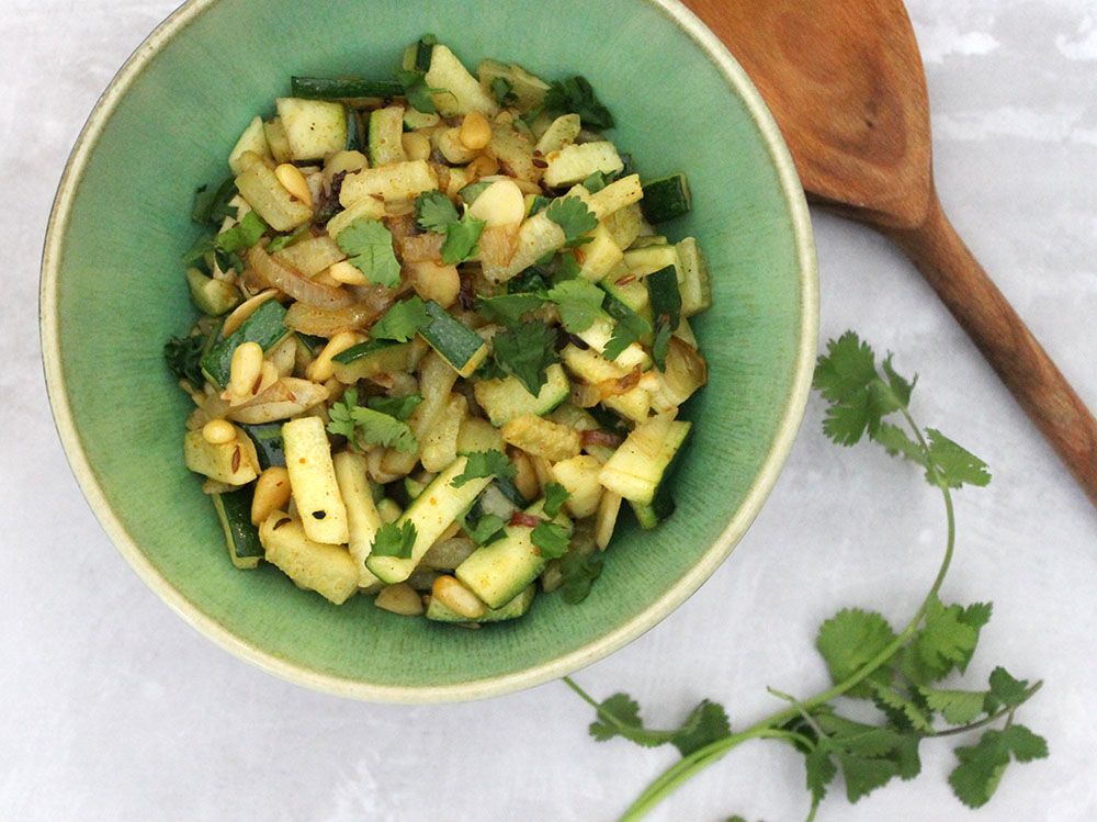 This Moroccan inspired zucchini is loaded with flavour and texture from aromatic herbs and spices and toasted nuts.