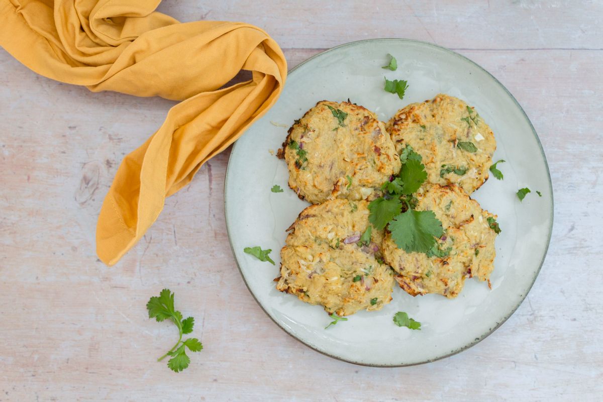 Finely shred the cabbage with a box grater and add to a mixing bowl - you should have about 1.5 cups worth of shredded cabbage. Finely chop the onion and cilantro and crush the garlic. Add to the bowl with the cabbage along with the ground cumin, salt, oil and coconut flour. Mix everything together well to combine.Step 2